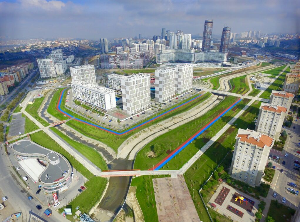 833 konuttan oluşan proje, yeşil alanlar, su öğeleri, yansıma havuzları, zemine oturan daireler ve önünde farklı tasarlanmış deck ...